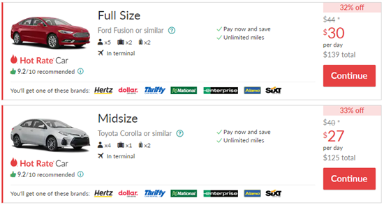 The platform offers lots of Hot Rate options for cars. They're listed with a red "Hot Rate Car" logo.