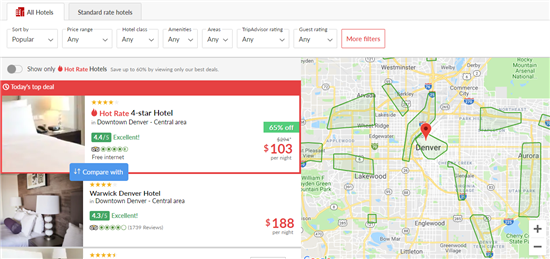 - Hot Rates: Patient customers can get steep discounts by booking reservations without knowing all the information beforehand. This is a great match for travelers on a budget.